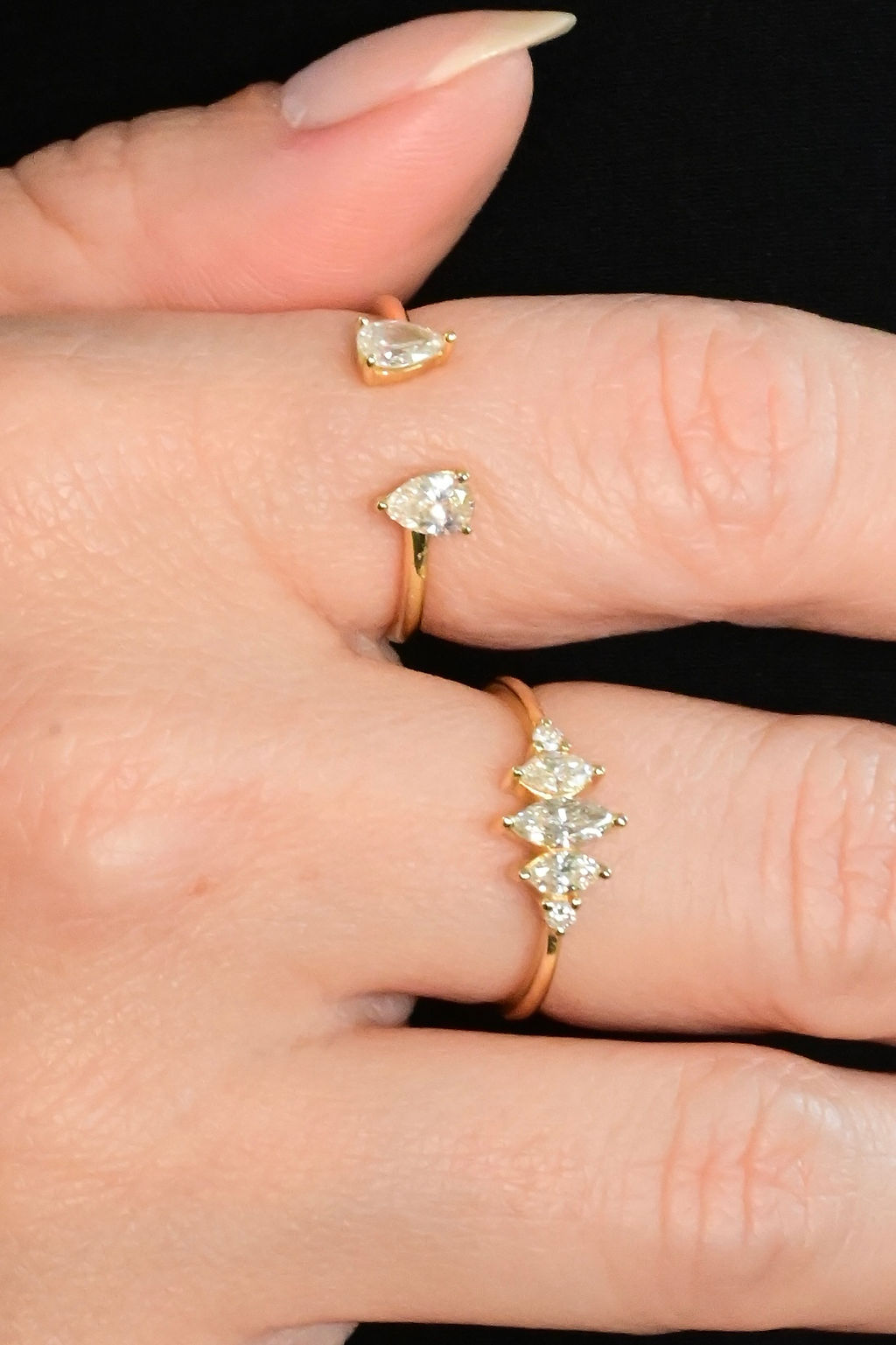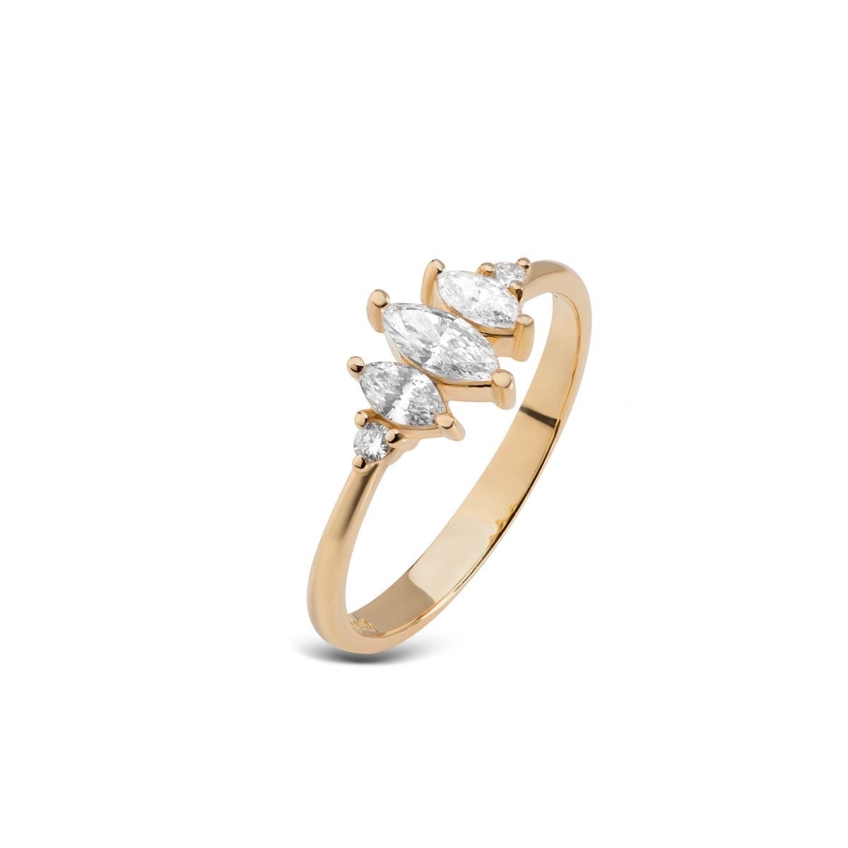 Anel em ouro amarelo 18k com diamantes lapidações navetes e brilhantes.