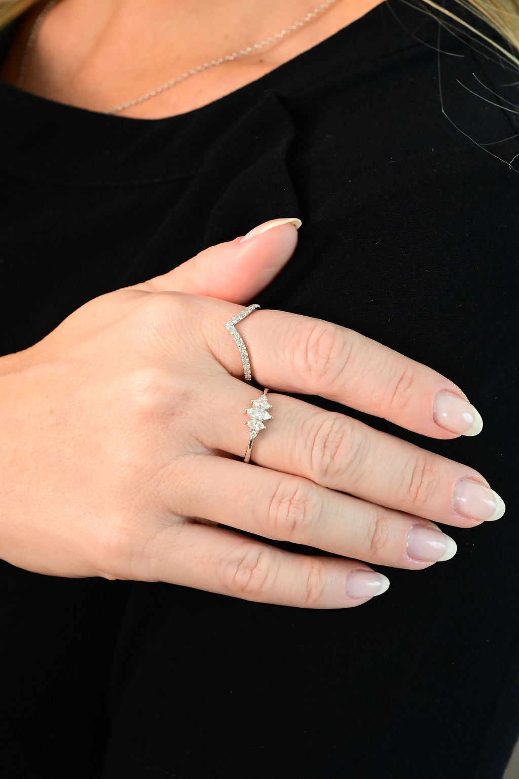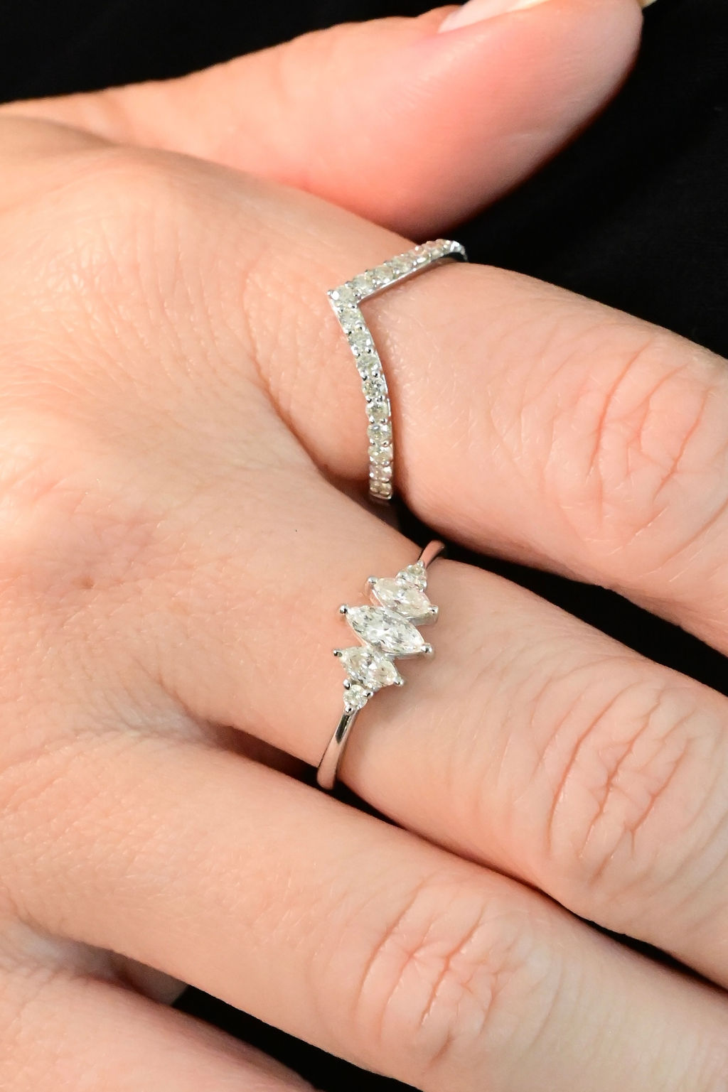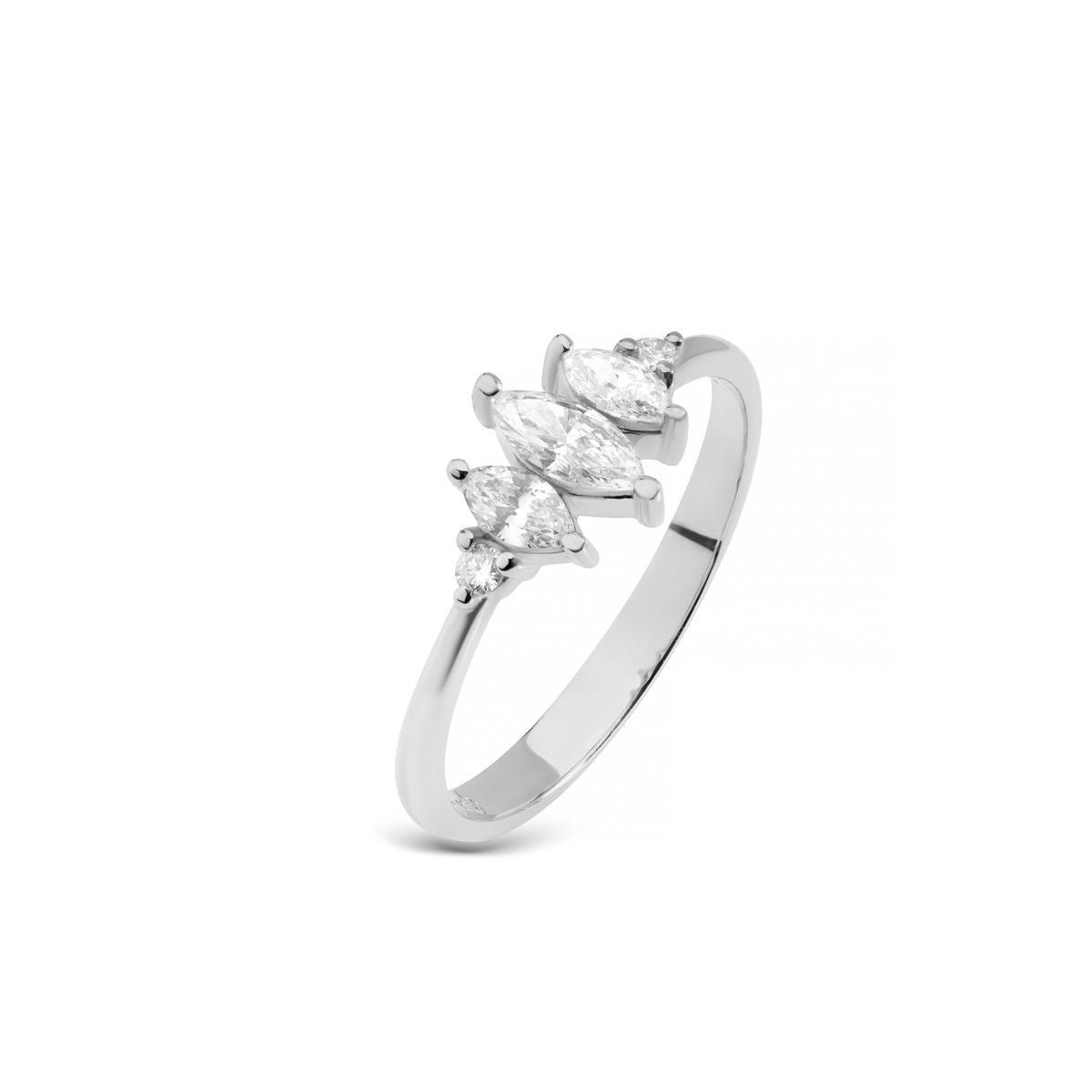 Anel em ouro branco 18k com diamantes lapidações navetes e brilhantes.