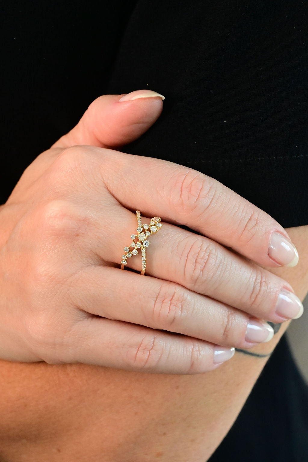 Anel em ouro amarelo 18k com formato de X cravejado de brilhantes de diversos tamanhos.