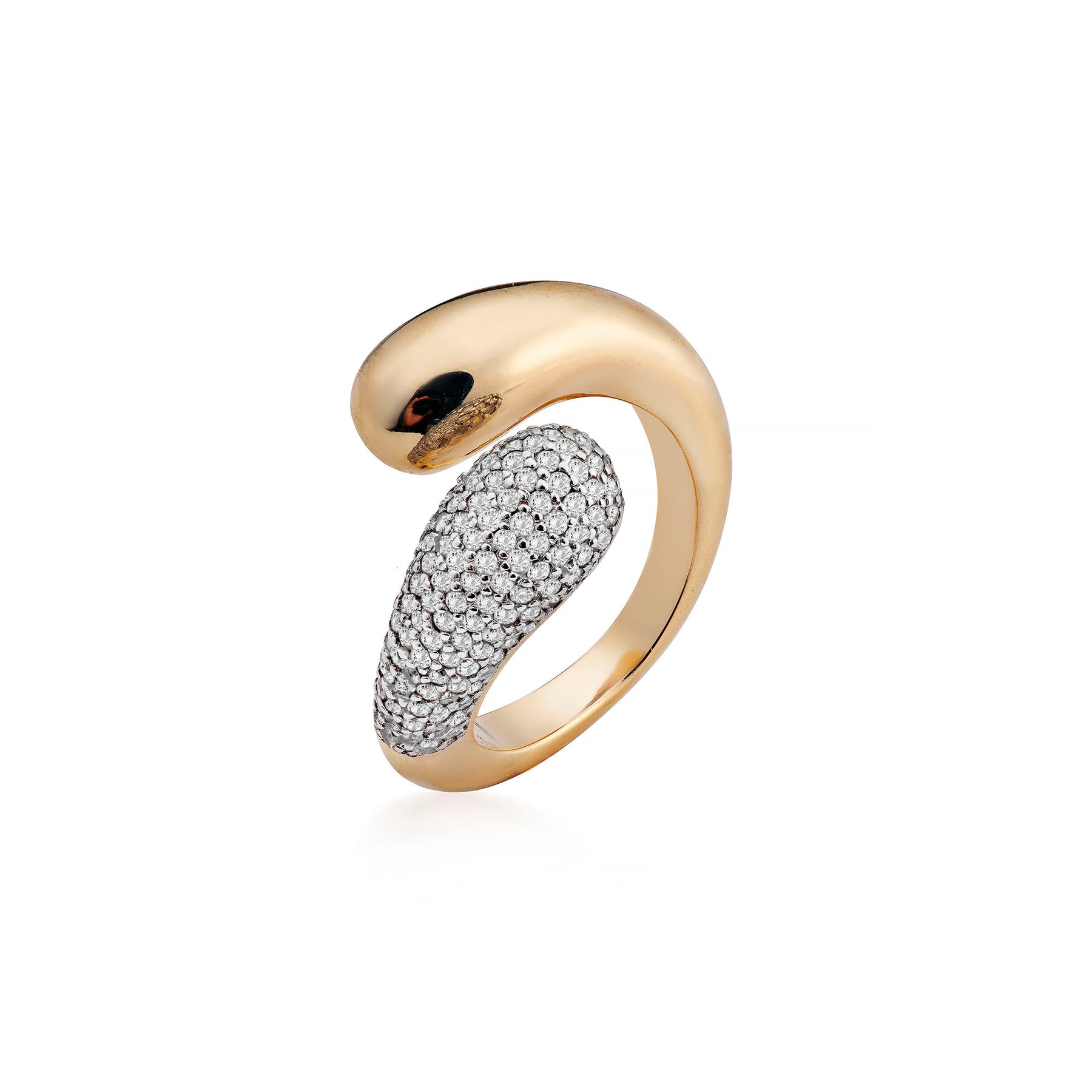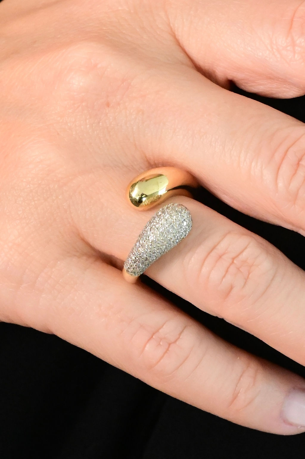 Anel em ouro amarelo 18k aberto com uma extremidade polida e outra extremidade em pavê de brilhantes (0,76ct).