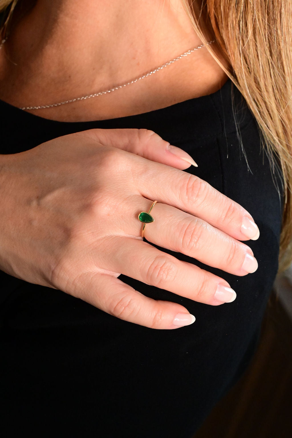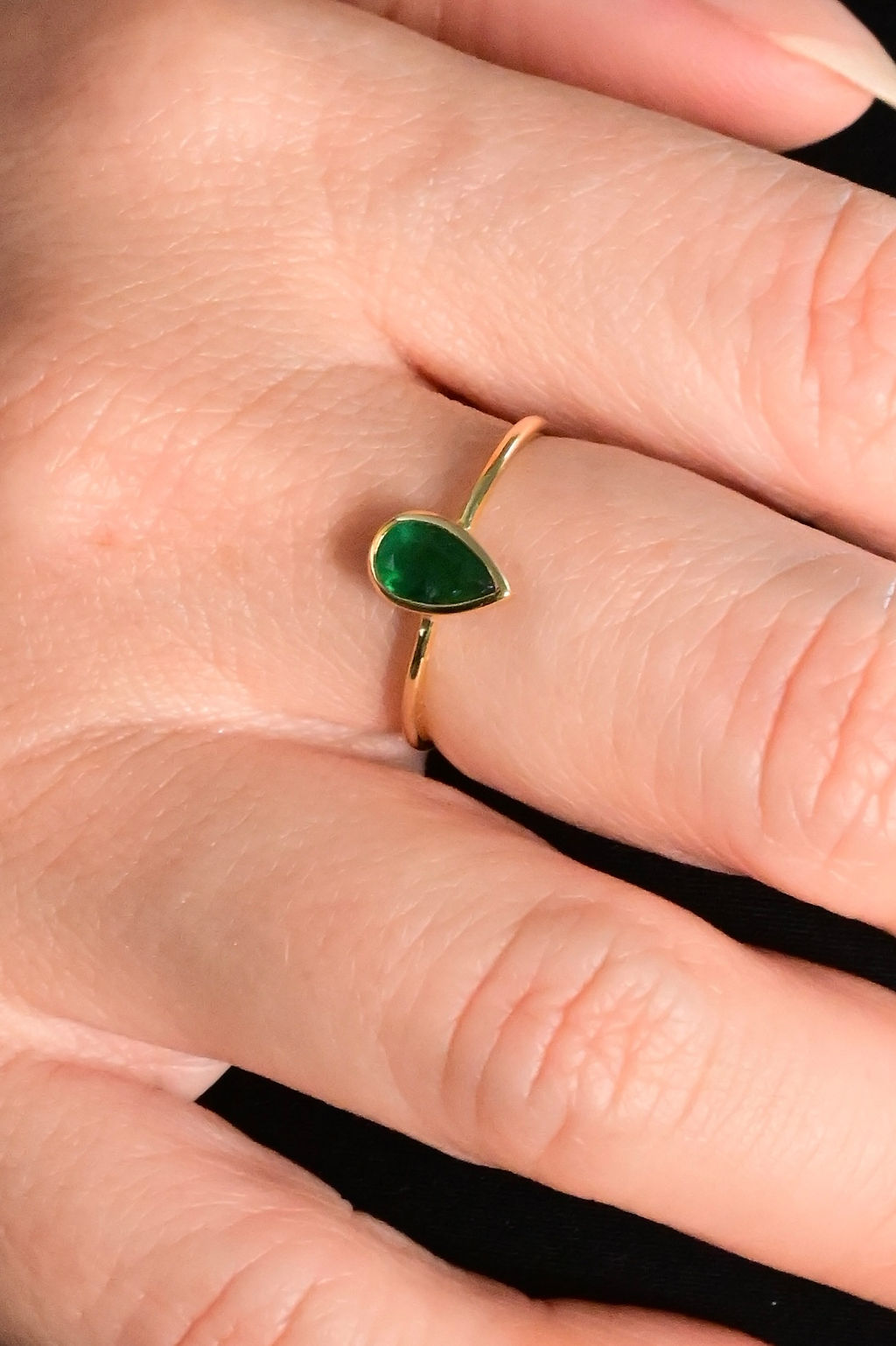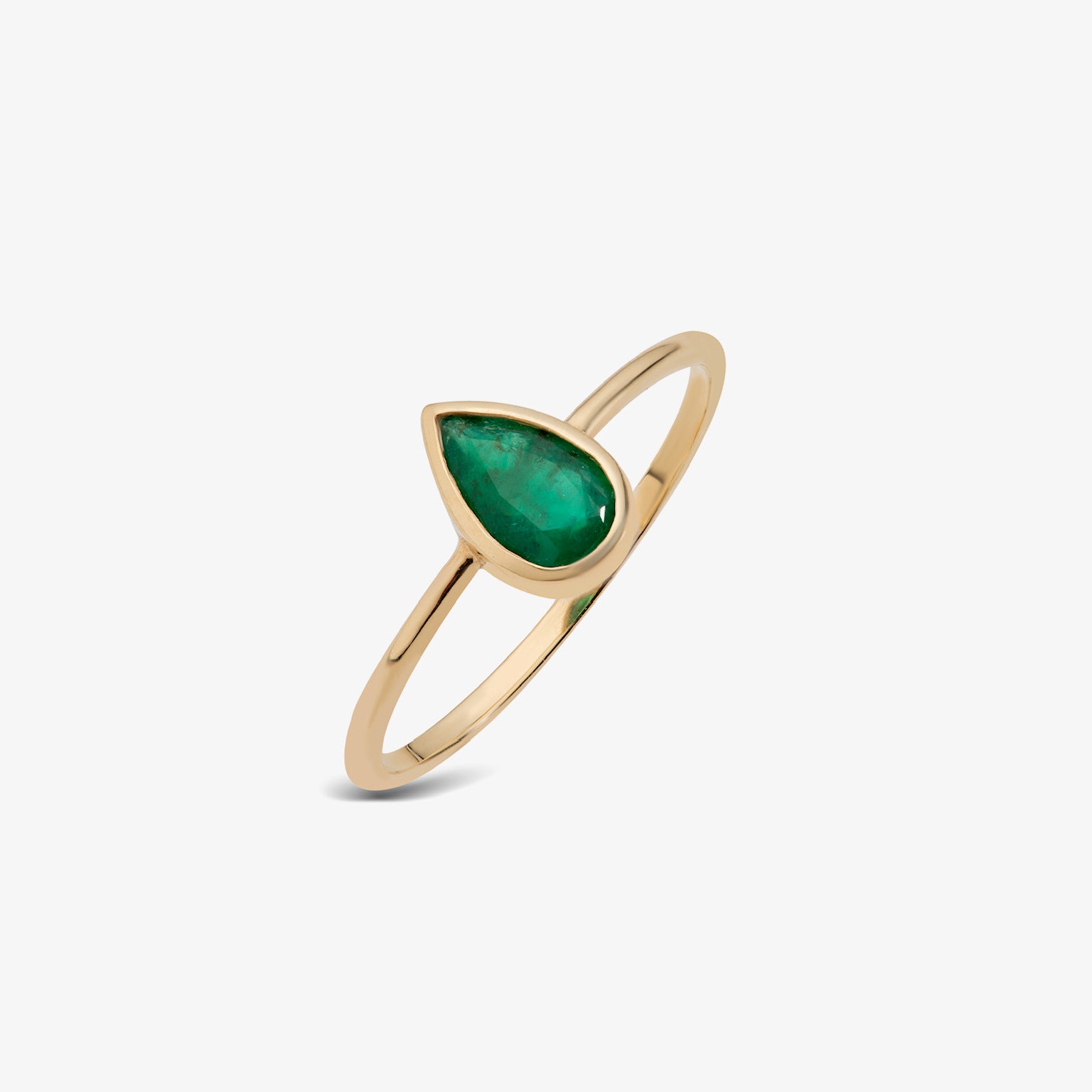 Anel em ouro amarelo 18k com esmeralda gota de 0,38ct em cravação inglesa.