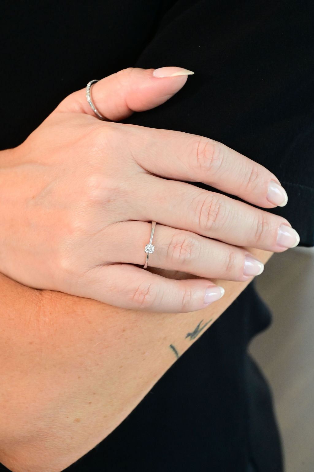 Anel solitario de brilhantes com aro liso em ouro branco 18k.